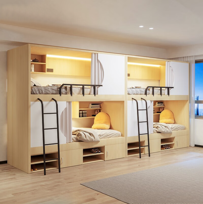 常見為二連體、三連體這兩種款式,分別運(yùn)用于四人間宿舍和六人間宿舍。這種公寓床的優(yōu)點(diǎn)是儲(chǔ)物空間大、學(xué)習(xí)空間大,休息區(qū)與學(xué)習(xí)區(qū)相互獨(dú)立又相互結(jié)合,功能齊全。并且隱私性較好,配備上隱私簾后就可以成為個(gè)人空間,是當(dāng)前各學(xué)校、企業(yè)購(gòu)買的一種主流宿舍床。