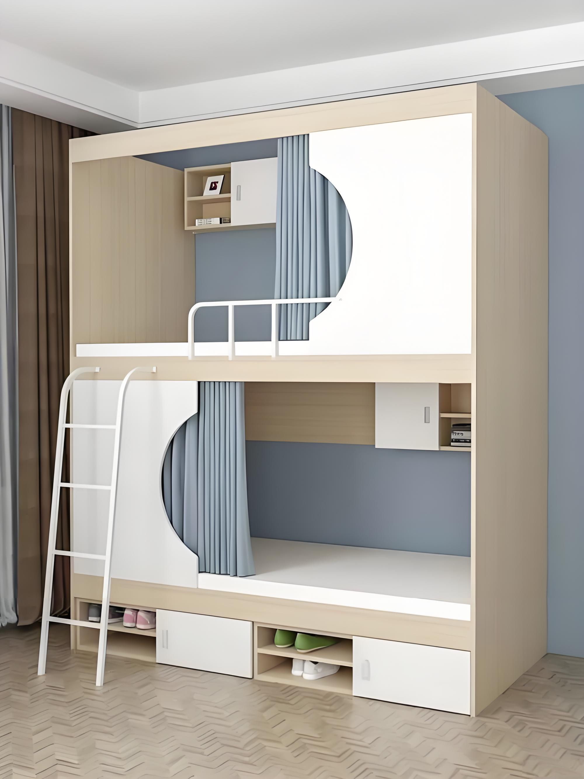 在集體空間(宿舍、合租屋)里,最缺的就是 “私人感”。鵬輝特意給每層都加了弧形遮光簾 + 半包圍擋板:拉上簾子,就能把小床變成獨(dú)立 “小單間”,追劇、午休都不會被打擾;柔和的淺藍(lán)窗簾 + 原木色柜體,還能讓逼仄的空間透出點(diǎn)溫馨松弛感,不像普通鐵架床那樣冷冰冰。