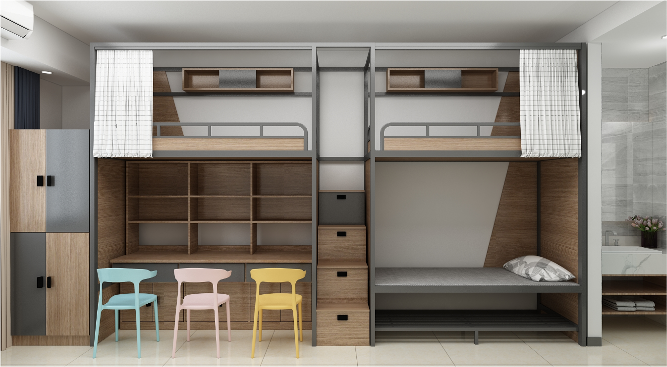 高中學校宿舍的標準配置通常包括上下鋪鐵床、儲物柜和桌椅。雖然這些組件的總價與兩連三位學生宿舍床相近,但傳統(tǒng)的配置對宿舍空間的需求更大。額外的空間建設(shè)費用并非小數(shù)目,可能會增加數(shù)百甚至數(shù)千元的支出。